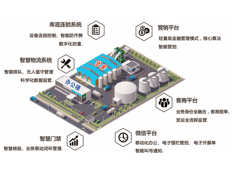 六大系统深度协同,构建物流 - 仓储 - 门禁 - 营销 - 客商 - 移动端全链路智能生态,以数字化、智能化手段重构运营流程,实现全场景高效管控、全流程精准监管,助力企业降本增效、安全合规,赋能产业高质量发展。